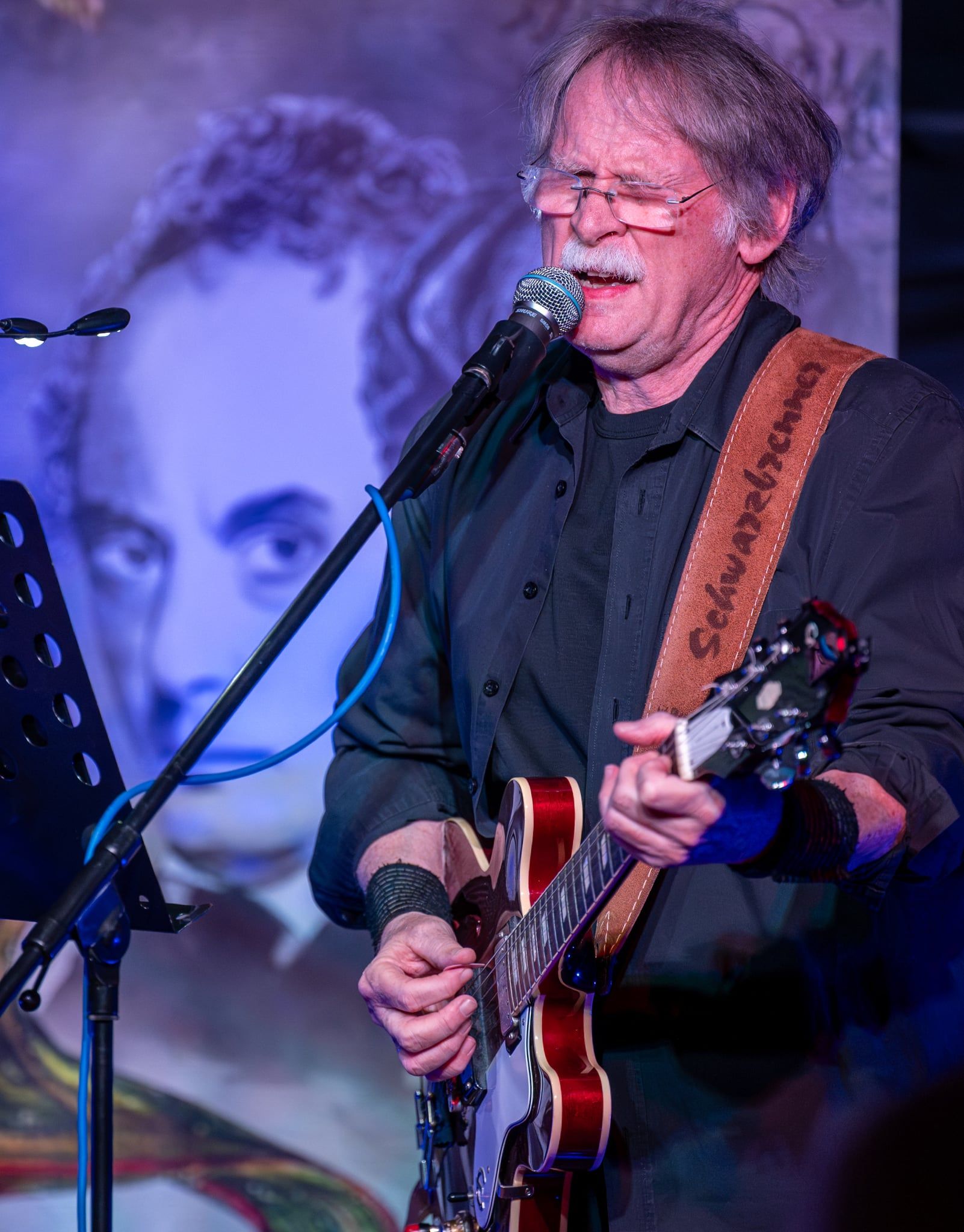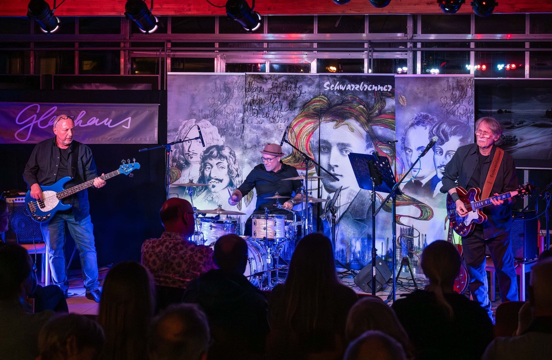 Ein Schlagzeuger, der auch Gedichte vorträgt und ein Gitarrist & Sänger, der auch Biographisches über die von ihm vertonten Dichter erzählt - zusammen mit einem stimmungsvollen Bühnenbild ergibt dies das Besondere eines Zimmer-Konzertes von Schwarzbrenner zu Zweit.